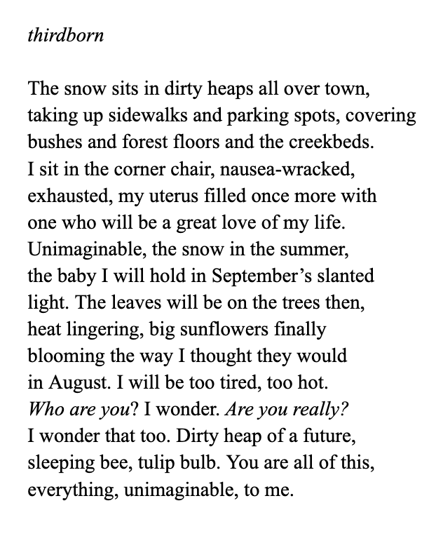Congratulations! I’m so happy for you and so excited to read whatever beautiful work emerges from this pregnancy experience.