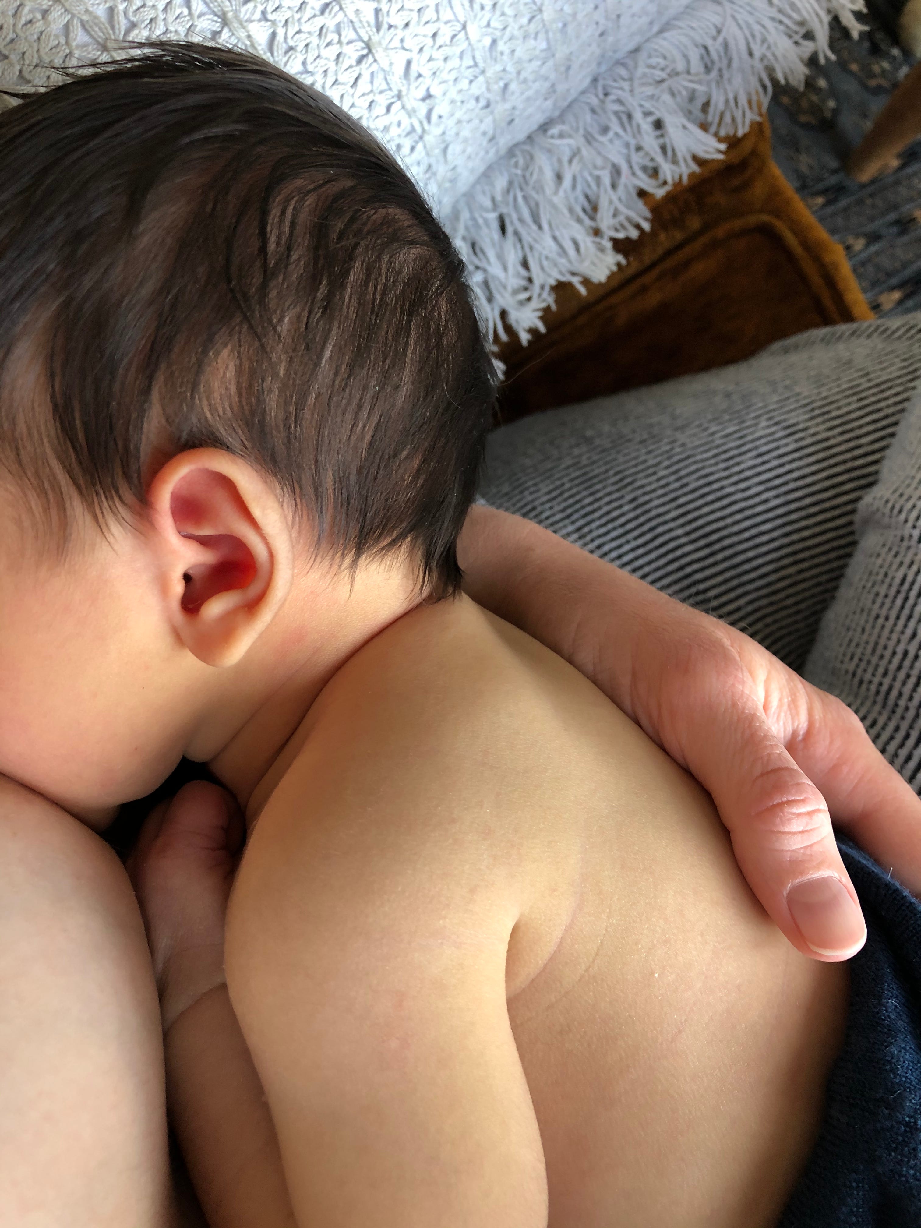 The beginning of our nursing relationship was difficult. I’d done a lot of research, but I still felt so ill-equipped to hold all the information in my mind after the wildness of giving birth. I mistakenly thought that it was every two to three hours after nursing that you were supposed to feed your newborn again, not every two to three hours from the start of the nursing session. (That is confusing, and should absolutely be extremely reiterated to both partners before anyone goes home!) My milk took a few days longer than usual to come in, and when it did I found myself at the extreme emotional lowpoint of my postpartum experience — just weeping and weeping and weeping, and in a lot of pain. Tommy wasn’t getting enough colostrum before my milk came in (not nursing frequently enough? weak latch? all of the above?), and once it did come in I was so engorged that he still couldn’t get enough — and I didn’t know yet how to hand-express or pump, or whether it was the right choice to do those things. So much conflicting information in the frantic google searching I was doing at all hours. I felt frozen and so afraid. I just kept putting him to my breast, which apparently was doing nothing. So Tommy was very, very hungry, and he became jaundiced. It wasn’t until an alarming telehealth appointment after-hours with our pediatrician that we realized that we were very near a medical emergency and we needed to immediately start triple feeding (nursing, then pumping, then feeding the pumped milk with a bottle or spoon, an extremely exhausting way to feed a newborn), and supplementing with formula to make sure that Tommy wouldn’t become severely dehydrated and malnourished and need to be rushed to the ER.